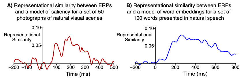 In these examples, RSA allows us to see how brain activity elicited by complex, natural stimuli can be related to computational models, using brain activity measured with the high temporal resolution and low cost of scalp ERP data. This technique is having a huge impact on the kinds of questions my lab is now asking. Specifically :